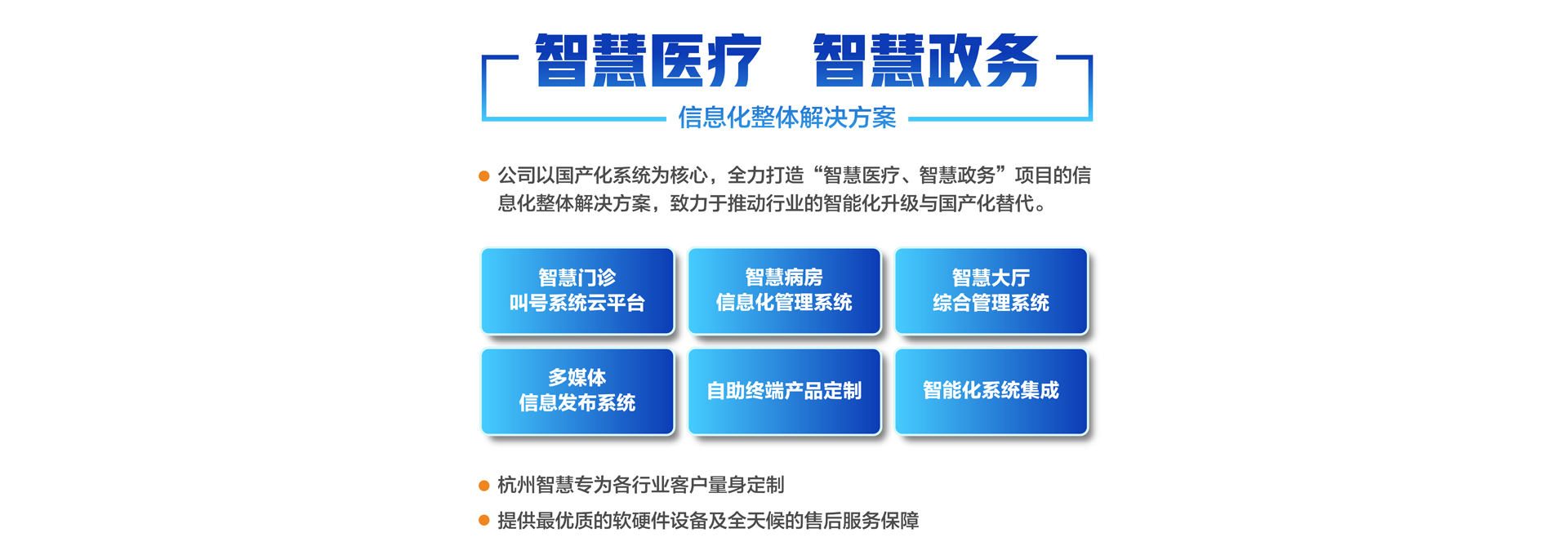 杭州智慧科技有限公司初創(chuàng)于2003年,總部位于重要的電子商務(wù)中心中國杭州公司主營業(yè)務(wù)有:智慧分診叫號系統(tǒng)、智慧病房醫(yī)護(hù)對講系統(tǒng)、智慧大廳綜合管理系統(tǒng)、智慧政務(wù)管理系統(tǒng)、智慧多媒體信息發(fā)布系統(tǒng)、導(dǎo)診系統(tǒng)及各自助終端產(chǎn)品定制。專為各行業(yè)客戶量身定制。公司已有20余年行業(yè)經(jīng)驗(yàn)沉淀積累,擁有優(yōu)秀的產(chǎn)品外觀設(shè)計(jì)師和各類中高級專業(yè)技術(shù)工程師,確保所研發(fā)的產(chǎn)品具有行業(yè)領(lǐng)先的外觀及可靠的技術(shù)性能。并擁有權(quán)威部門頒發(fā)的各類知識(shí)產(chǎn)權(quán)及專利證書,30多項(xiàng)資質(zhì)證書、800多個(gè)合作伙伴、2000多個(gè)項(xiàng)目成功案例經(jīng)驗(yàn)。 智慧產(chǎn)品已遍及全國各醫(yī)療、政務(wù)、金融、通訊、公安、工商、稅務(wù)等行業(yè),形成以“立足杭州、輻射長三角、拓展全國”的戰(zhàn)略發(fā)展格局,產(chǎn)品經(jīng)過歷年不斷創(chuàng)新,形成專業(yè)化、平臺(tái)化,致力于成為智慧產(chǎn)品的領(lǐng)軍企業(yè)。 公司建立了完善的技術(shù)培訓(xùn)及售后服務(wù)中心,并設(shè)24小時(shí)熱線咨詢電話解答用戶反饋的問題。同時(shí)應(yīng)客戶要求定期派技術(shù)人員到 全國各地進(jìn)行技術(shù)指導(dǎo)輔助用戶正確使用智慧產(chǎn)品并能獨(dú)立安裝、調(diào)試、日常維護(hù)等工作。提供最優(yōu)質(zhì)的設(shè)備及全天候的售后服務(wù)保障,智慧永恒不變的服務(wù)宗旨——致力于客戶的滿意與成功!...